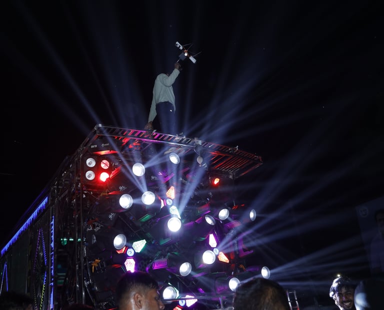 A moving celebration on wheels, ideal for the baarat or pre-wedding processions. Packed with speakers, lights, and energy that follows you everywhere.